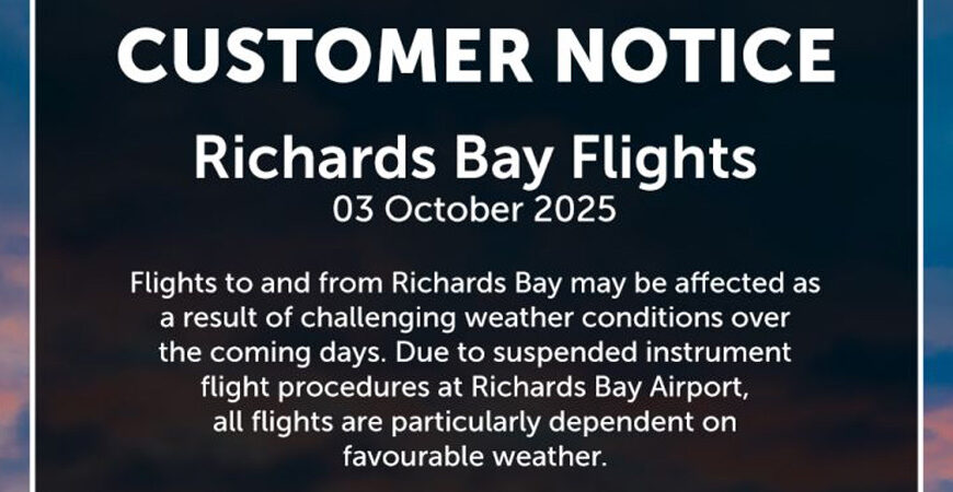 | – Flights to and from Richards Bay may be affected as a result of challenging weather conditions over the coming days. Due to suspended instrument flight procedures at Richards Bay Airport, all flights are particularly dependent on favourable weather. While such circumstances are beyond our control, each flight is thoroughly assessed before departure to […]
